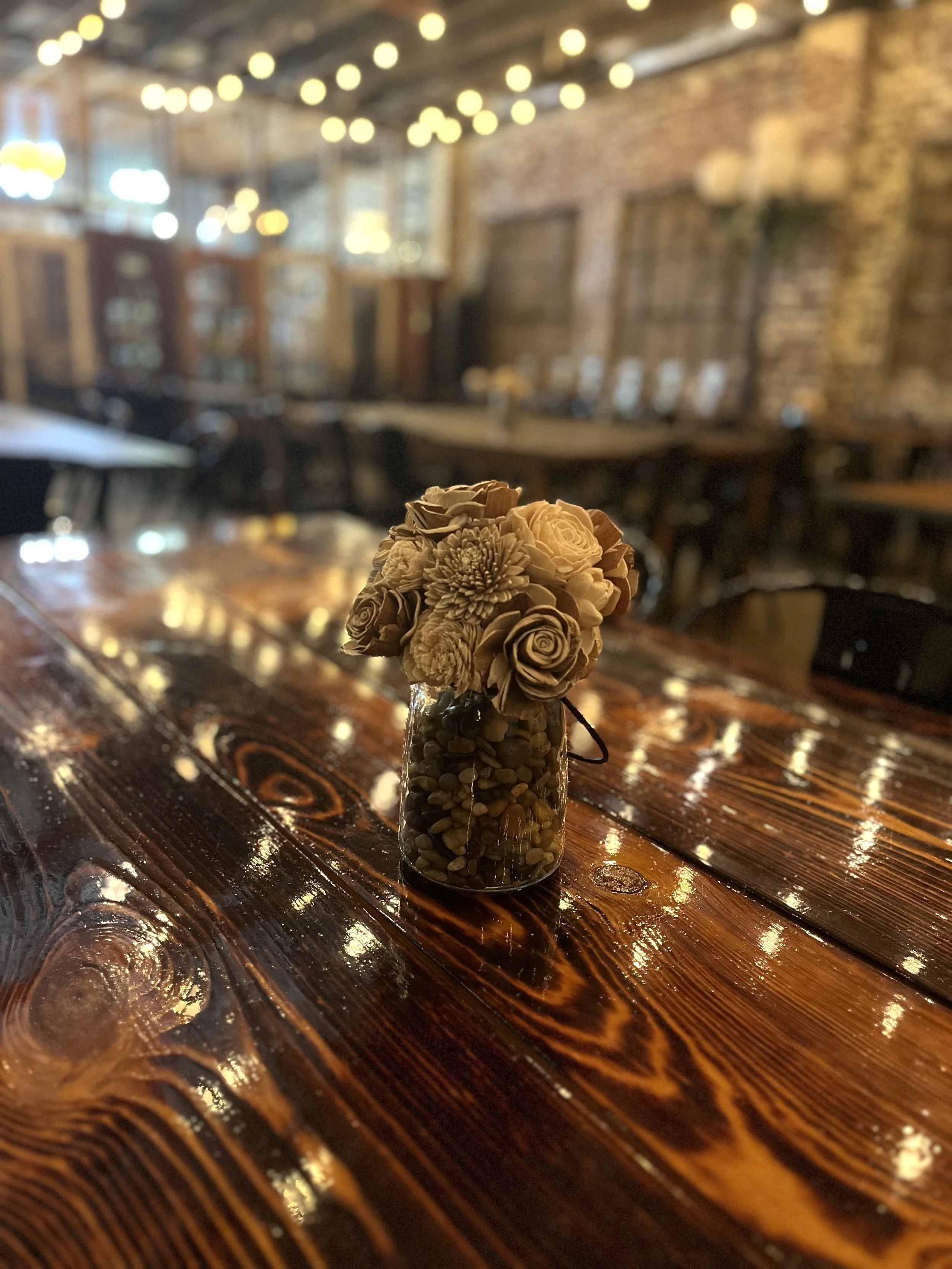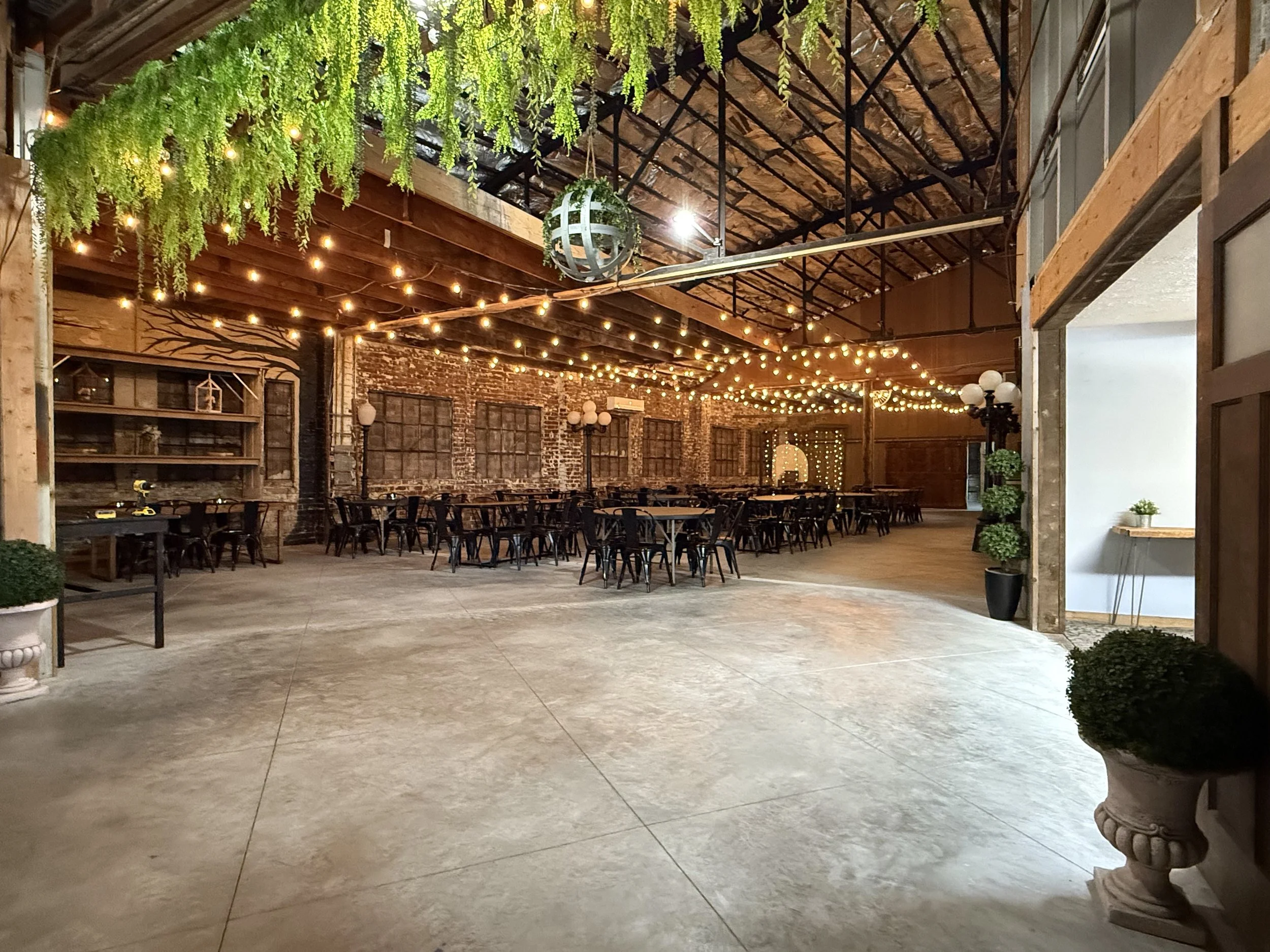 Step inside and you’ll immediately feel the warm, rustic ambiance. Exposed brick walls, reclaimed metal and pallet wood accents, soaring warehouse-style ceilings, and concrete floors set the tone. Our space is furnished with custom-made wood and metal tables, handcrafted by two talented local artists, and paired with black metal farmhouse chairs for a stylish yet comfortable setup. Overhead, bistro lights cast a cozy glow—perfect for gatherings of all kinds.